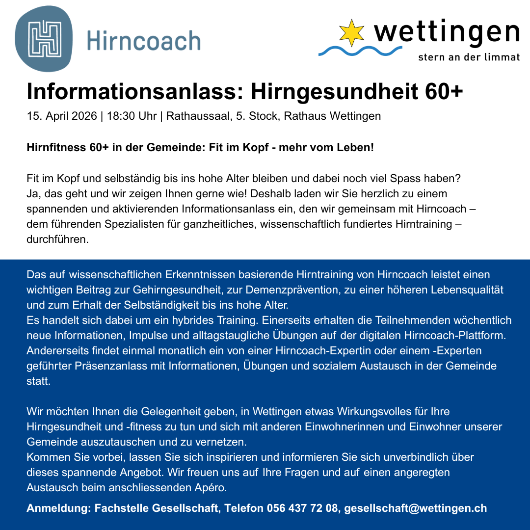 Der Anlass wird gemeinsam mit Hirncoach durchgeführt, dem führenden Spezialisten für ganzheitliches Hirntraining. Vorgestellt wird ein hybrides Trainingsangebot, das digitale Impulse mit regelmässigen Präsenztreffen in der Gemeinde kombiniert und neben geistiger Fitness auch den sozialen Austausch fördert.